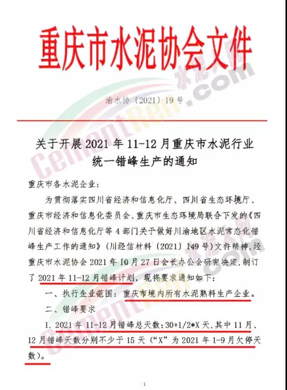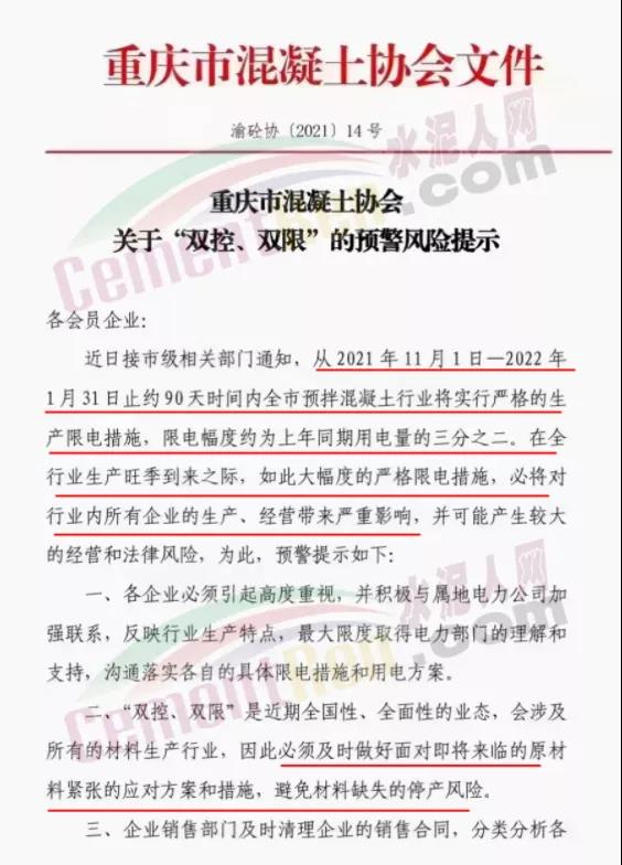 綜上所述,各地針對于高耗能企業(yè)的電價控制以及限電、限產要求加嚴,此前重慶市混凝土協(xié)會發(fā)布《關于“雙控、雙限”的預警風險提示》要求從 2021年11月1日~2022年1月31日止約90天時間內全市預拌混凝土行業(yè)將實行嚴格的生產限電措施,限電幅度約為上年同期用電量的三分之二。同期,重慶市水泥協(xié)會發(fā)文要求轄區(qū)水泥企業(yè)自11月1日起執(zhí)行錯峰生產。水泥成本增加同時供應量減少,水泥價格應聲上漲100-150元/噸。但因下游商混企業(yè)同樣面臨限電限產,水泥價格提漲落實情況不理想。