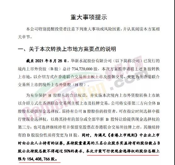 據(jù)華新水泥此前公告,截至2021年8月25日,華新水泥股份有限公司已發(fā)行的境內(nèi)上市外資股(B股)總計(jì)734,720,000股。本次方案擬申請(qǐng)將上述B股轉(zhuǎn)換上市地,以介紹方式在香港聯(lián)合交易所主板上市及掛牌交易,變更為在香港聯(lián)合交易所上市的境外上市外資股(H股)。