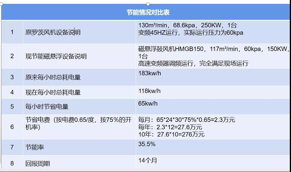 實際運行情況表明,華東風(fēng)機3臺風(fēng)機均可達到生產(chǎn)所需風(fēng)量風(fēng)壓等要求,運行平穩(wěn),噪音低,節(jié)能效果顯著,每小時可節(jié)省電量65kw/h,節(jié)能率35.5%,按電費0.65元/度,75%的開機率計算,平均每月可節(jié)省電費2.3萬元。具體節(jié)能情況如下表: