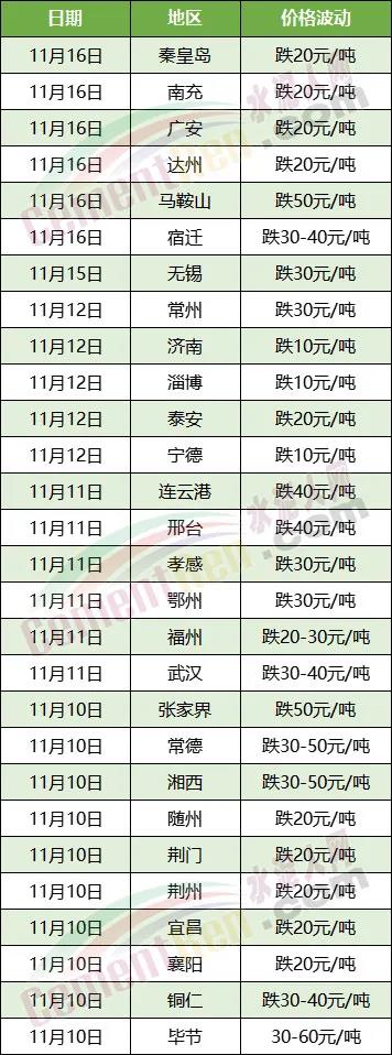 水泥消費核心區(qū)域跌價,引發(fā)大面積的價格塌方。11月中旬以來湖南、安徽、廣西、湖北、四川、貴州、福建、山東、河北等十幾個省水泥價格陸續(xù)下跌。