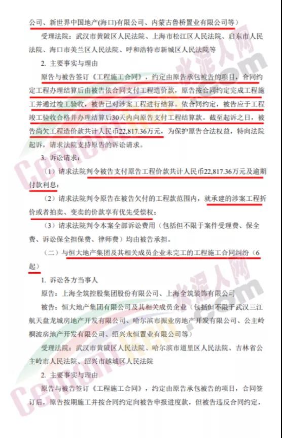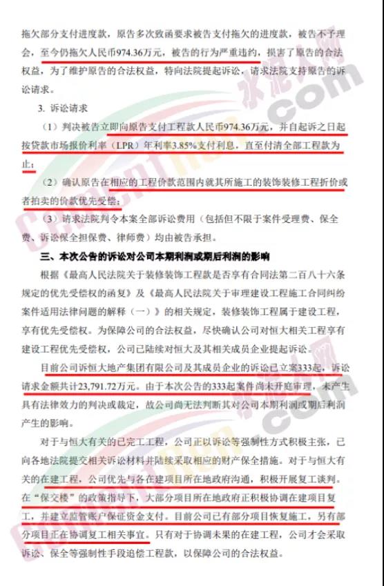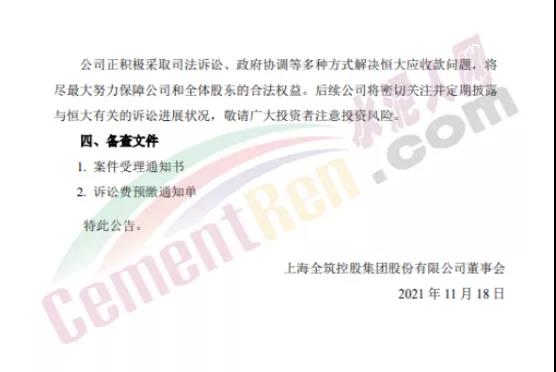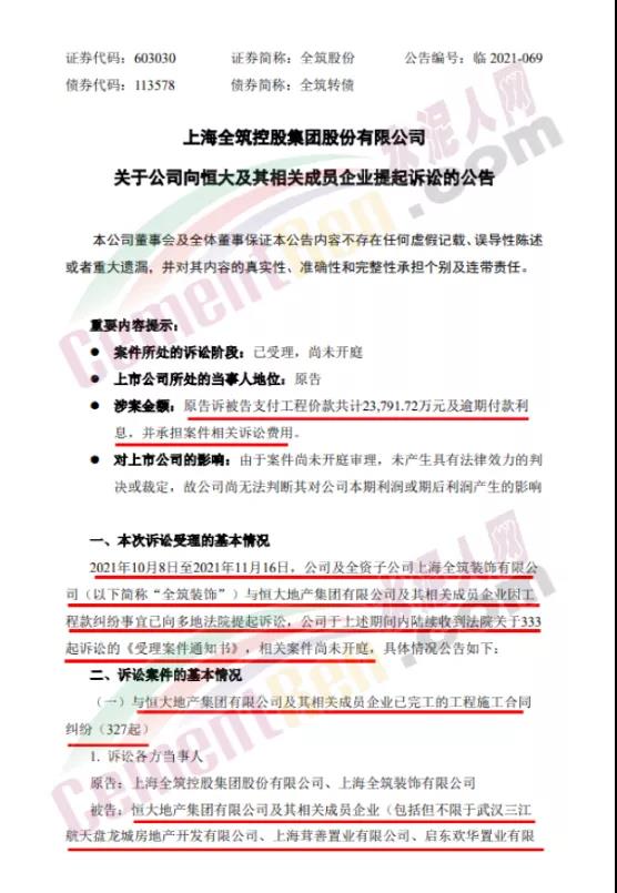 11月17日晚間,全筑股份公告稱,公司及全資子公司全筑裝飾與恒大地產(chǎn)集團及其相關(guān)成員企業(yè)因工程款糾紛事宜已向多地法院提起訴訟。全筑股份訴恒大方面支付工程價款共計2.38億元及逾期付款利息,并承擔(dān)案件相關(guān)訴訟費用。全筑股份表示,正積極采取司法訴訟、政府協(xié)調(diào)等多種方式解決恒大應(yīng)收款問題。