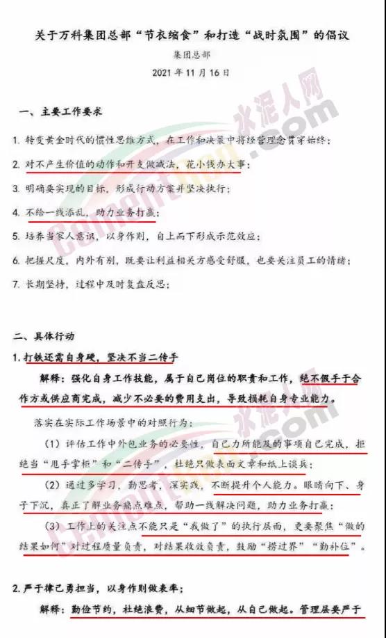 同期,萬科總部下發(fā)了一份主題為《關(guān)于萬科集團總部“節(jié)衣縮食”和打造“戰(zhàn)時氛圍”的倡議》,共提出7點工作要求兩條具體行動。