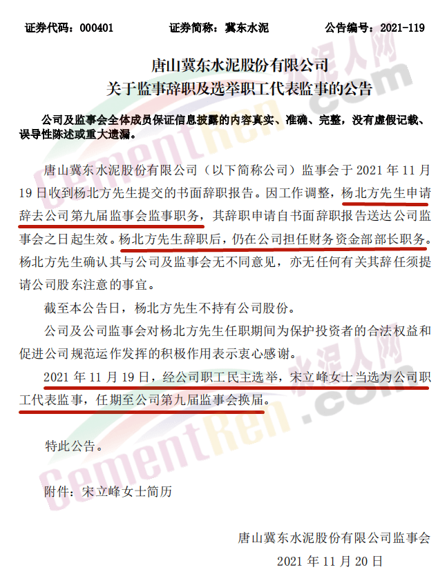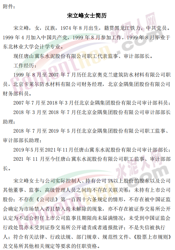 日前,冀東水泥發(fā)布《唐山冀東水泥股份有限公司關(guān)于監(jiān)事辭職及選舉職工代表監(jiān)事的公告》稱,楊北方先生申請辭去公司第九屆監(jiān)事會監(jiān)事職務(wù),辭職后,仍在公司擔(dān)任財務(wù)資金部部長職務(wù)。經(jīng)公司職工民主選舉,宋立峰女士當(dāng)選為公司職工代表監(jiān)事,任期至公司第九屆監(jiān)事會換屆。具體公告如下: