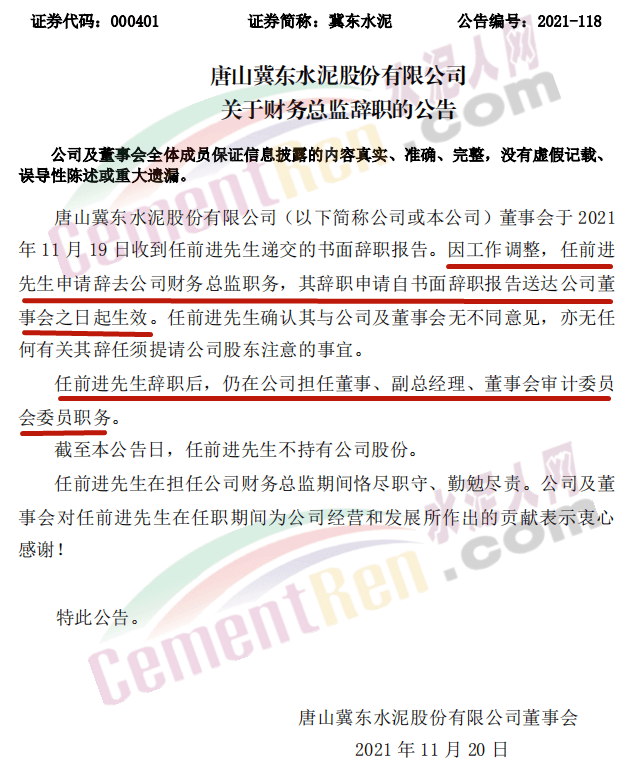 ?同日,唐山冀東水泥股份有限公司發(fā)布關(guān)于財務(wù)總監(jiān)辭職的公告稱,因工作調(diào)整,任前進(jìn)先生申請辭去公司財務(wù)總監(jiān)職務(wù),任前進(jìn)先生辭職后,仍在公司擔(dān)任董事、副總經(jīng)理、董事會審計委員會委員職務(wù)。具體公告如下: