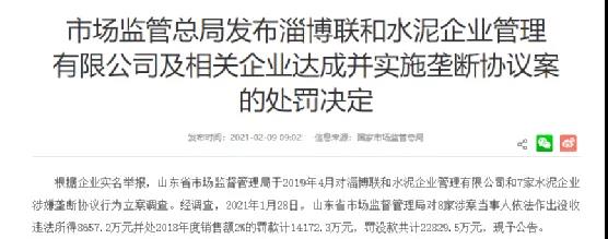 據(jù)了解,今年2月9日國(guó)家市場(chǎng)監(jiān)督管理總局反壟斷局發(fā)布淄博聯(lián)合水泥企業(yè)管理有限公司及相關(guān)企業(yè)達(dá)成并實(shí)施壟斷協(xié)議案的處罰決定。2021年1月28日,山東省市場(chǎng)監(jiān)督管理局對(duì)8家涉案當(dāng)事人依法作出沒(méi)收違法所得8657.2萬(wàn)元并處2018年度銷(xiāo)售額2%的罰款計(jì)14172.3萬(wàn)元,罰沒(méi)款共計(jì)22829.5萬(wàn)元。