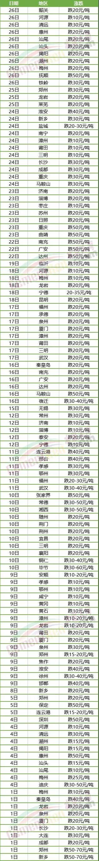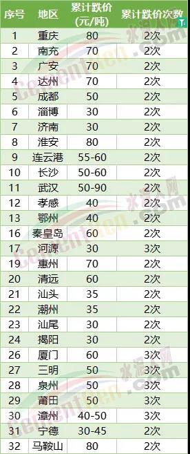 四川南充、廣安、達(dá)州、成都;山東淄博、濟(jì)南;江蘇淮安、連云港;湖北武漢、孝感、鄂州;廣東河源、惠州、清遠(yuǎn)、汕頭、潮州、汕尾、揭陽;福建廈門、三明、泉州、莆田、漳州、寧德;安徽馬鞍山、河北秦皇島、湖南長沙以及重慶地區(qū)28個(gè)城市連續(xù)2-3輪下調(diào)水泥報(bào)價(jià),累計(jì)跌價(jià)30-80元/噸。