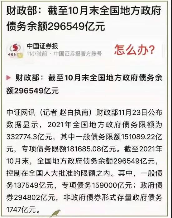 截至2021年10月末,全國地方政府債務(wù)余額296549億元,控制在全國人大批準(zhǔn)的限額之內(nèi)。其中,一般債務(wù)137549億元,專項(xiàng)債務(wù)159000億元;政府債券294802億元,非政府債券形式存量政府債務(wù)1747億元。