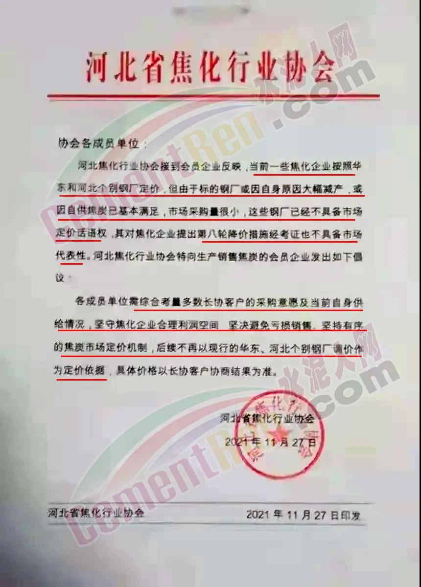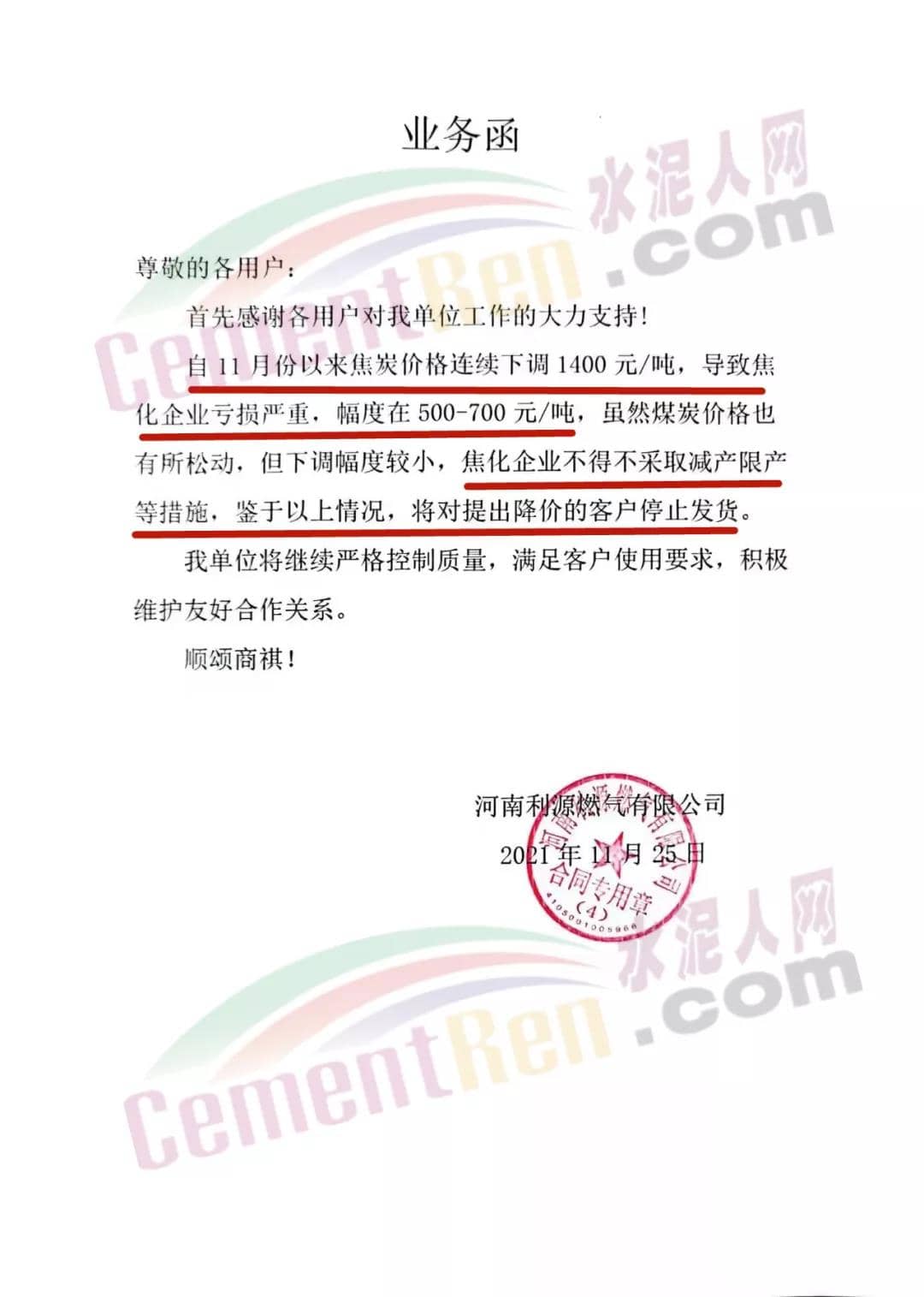 告知函中提到,近期鋼企(下游客戶)原料采購價格回落,利潤修復,與此同時,焦企(原料供應(yīng)商)受原料煤市場止跌、部分煤種反彈等因素影響,虧損加大,因此堅決抵制降價。據(jù)水泥人網(wǎng)了解,近期發(fā)出這類告知函的企業(yè)不在少數(shù),有些企業(yè)甚至明確,對于繼續(xù)提出降價的客戶停止發(fā)貨。
