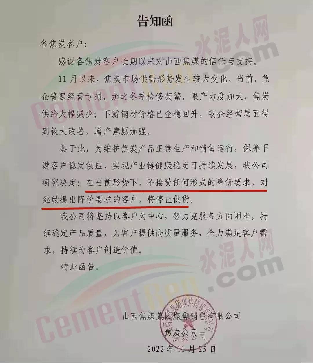 山西焦煤集團煤焦銷售有限公司:為維護焦炭產(chǎn)品正常生產(chǎn)和銷售運行,保障下游客戶穩(wěn)定供應(yīng),實現(xiàn)產(chǎn)業(yè)鏈健康穩(wěn)定可持續(xù)發(fā)展,研究決定:在當前形勢下,不接受任何形式的降價要求,對繼續(xù)提出降價要求的客戶,將停止供貨。