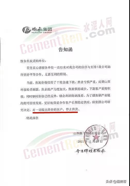 山西鵬飛集團:為了煤焦鋼產(chǎn)業(yè)鏈均衡可持續(xù)發(fā)展,更好地保證合作客戶長期穩(wěn)定供應(yīng),經(jīng)集團公司研究決定:對一切提出降價的客戶,停止供貨。
