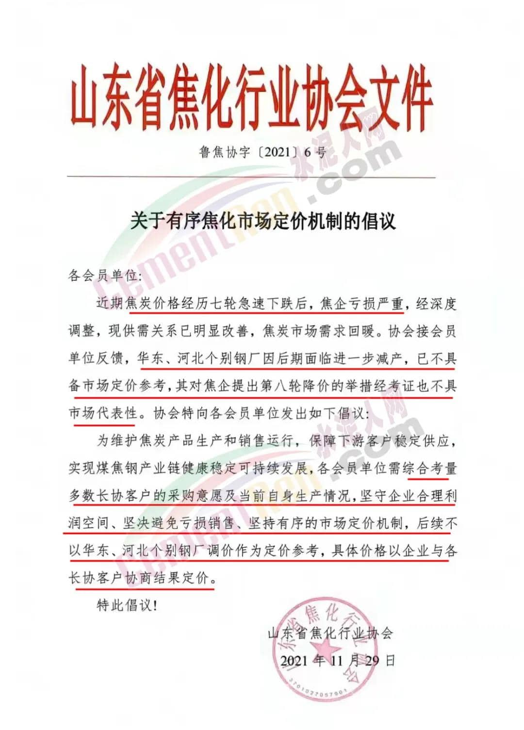 為維護焦炭產(chǎn)品生產(chǎn)和銷售運行,保障下游客戶穩(wěn)定供應(yīng),實現(xiàn)煤焦鋼產(chǎn)業(yè)鏈健康穩(wěn)定可持續(xù)發(fā)展,各會員單位需綜合考量多數(shù)長協(xié)客戶的采購意愿及當前自身生產(chǎn)情況,堅守企業(yè)合理利潤空間、堅決避免虧損銷售、堅持有序的市場定價機制,后續(xù)不以華東、河北個別鋼廠調(diào)價作為定價參考,具體價格以企業(yè)與各長協(xié)客戶協(xié)商結(jié)果定價。