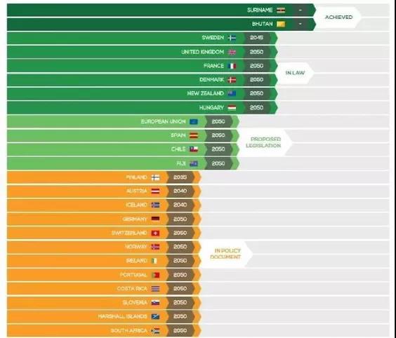 “碳中和、碳達(dá)峰”是全球各國的共識,目前已有數(shù)十個國家和地區(qū)提出了“零碳”或“碳中和”的氣候目標(biāo),Energy & Climate Intelligence Unit 的凈零排放跟蹤表統(tǒng)計了各個國家進(jìn)展情況,包括:已實(shí)現(xiàn)的2個國家,已立法的6個國家,處于立法中狀態(tài)的包括歐盟(作為整體)和其他3個國家。