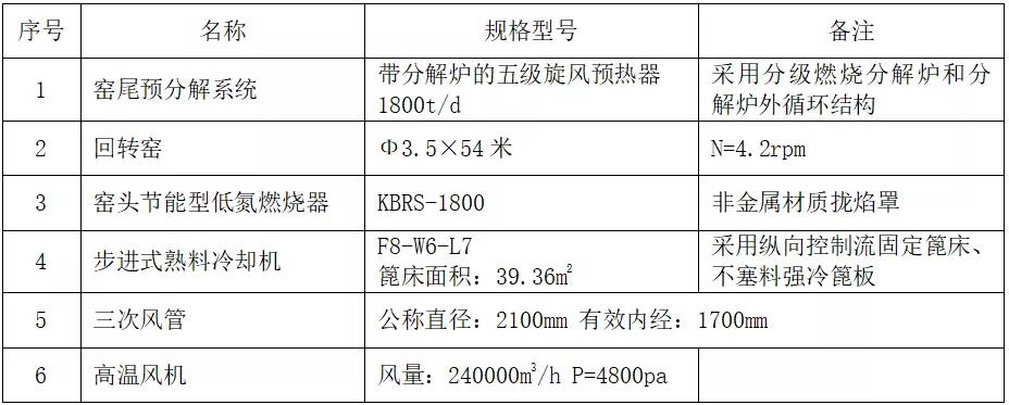 據(jù)科邦高級工程師郭紅軍介紹,采用這項(xiàng)技術(shù)的水泥廠,設(shè)計生產(chǎn)規(guī)模為1800t/d,配備Φ3.5*54米回轉(zhuǎn)窯,窯尾采用帶分解爐的五級旋風(fēng)預(yù)熱器,采用升級型的第四代步進(jìn)式篦冷機(jī),窯頭采用節(jié)能型低氮燃燒器。燒成系統(tǒng)主要設(shè)備配置情況見下表: