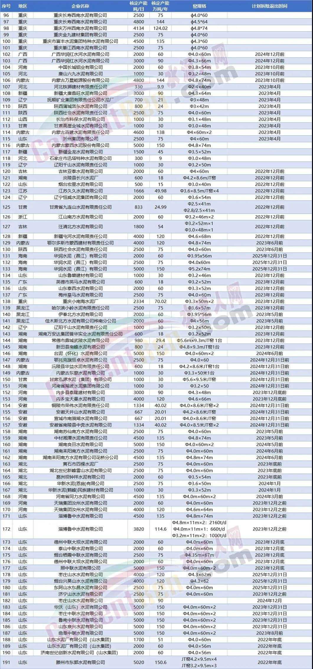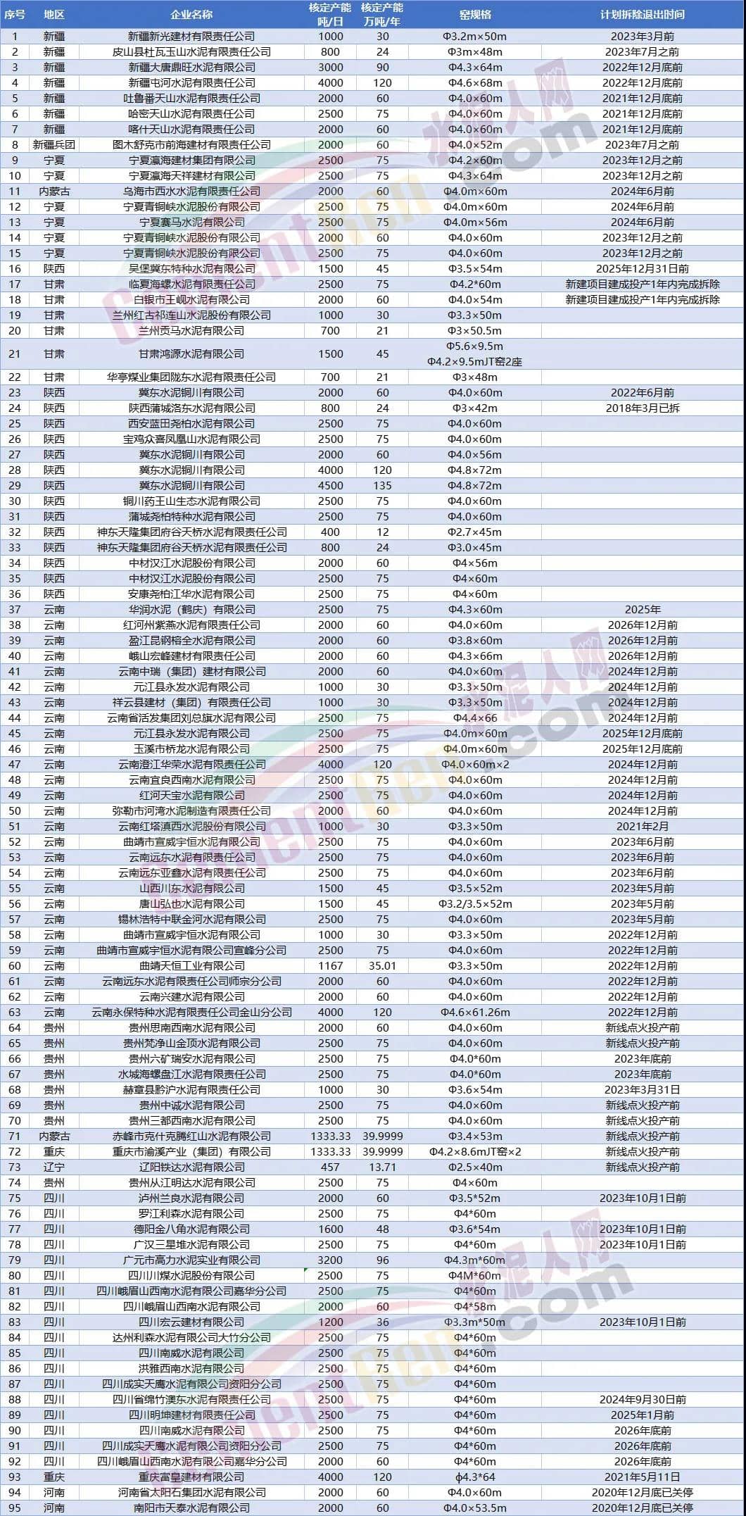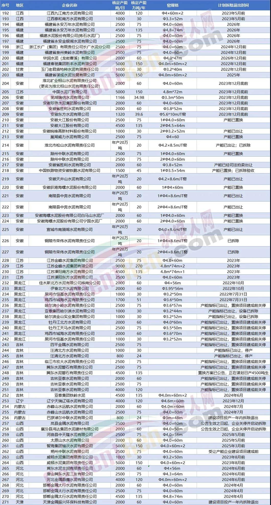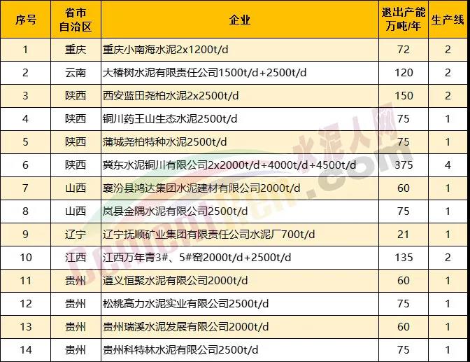 另?yè)?jù)水泥人網(wǎng)不完全統(tǒng)計(jì)今年以來(lái)已經(jīng)有20多條水泥熟料生產(chǎn)線發(fā)布關(guān)停拆除消息。涉及陜西 、貴州、山西、江西、云南、重慶、遼寧7個(gè)省市自治區(qū)合計(jì)14個(gè)項(xiàng)目21條生產(chǎn)線。退出產(chǎn)能合計(jì)1428萬(wàn)噸/年。其中包括冀東水泥銅川有限公司4條熟料生產(chǎn)線,退出產(chǎn)能達(dá)375萬(wàn)噸/年,以及重慶小南海水泥72萬(wàn)噸/年熟料產(chǎn)能。