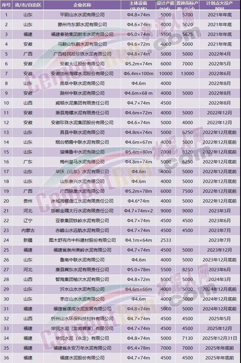 同時(shí),有大量的智能化高產(chǎn)水泥生產(chǎn)線陸續(xù)建成投產(chǎn)。據(jù)不完全統(tǒng)計(jì)從2021年至2025年底前將有37條5340.9萬(wàn)噸/年。新型干法水泥熟料生產(chǎn)線點(diǎn)火投產(chǎn)。擬于2021年12月-2025年12月期間點(diǎn)火投產(chǎn)部分生產(chǎn)線如下: