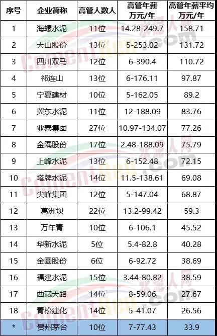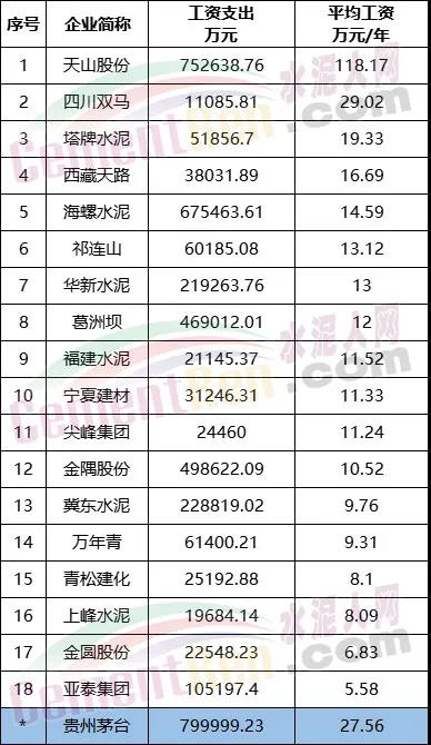 對比上市公司最新公布的水泥行業(yè)高管年薪及員工平均薪酬,水泥行業(yè)18家上市公司,海螺水泥以高管年薪平均158.71萬元/年位于首位,天山股份員工年薪平均131.72萬元/年位于第二位。按最新公布數(shù)據(jù)計算,海螺水泥高管平均年薪較貴州茅臺高出124.81萬元/年,員工平均工資卻低出12.97萬元/年。