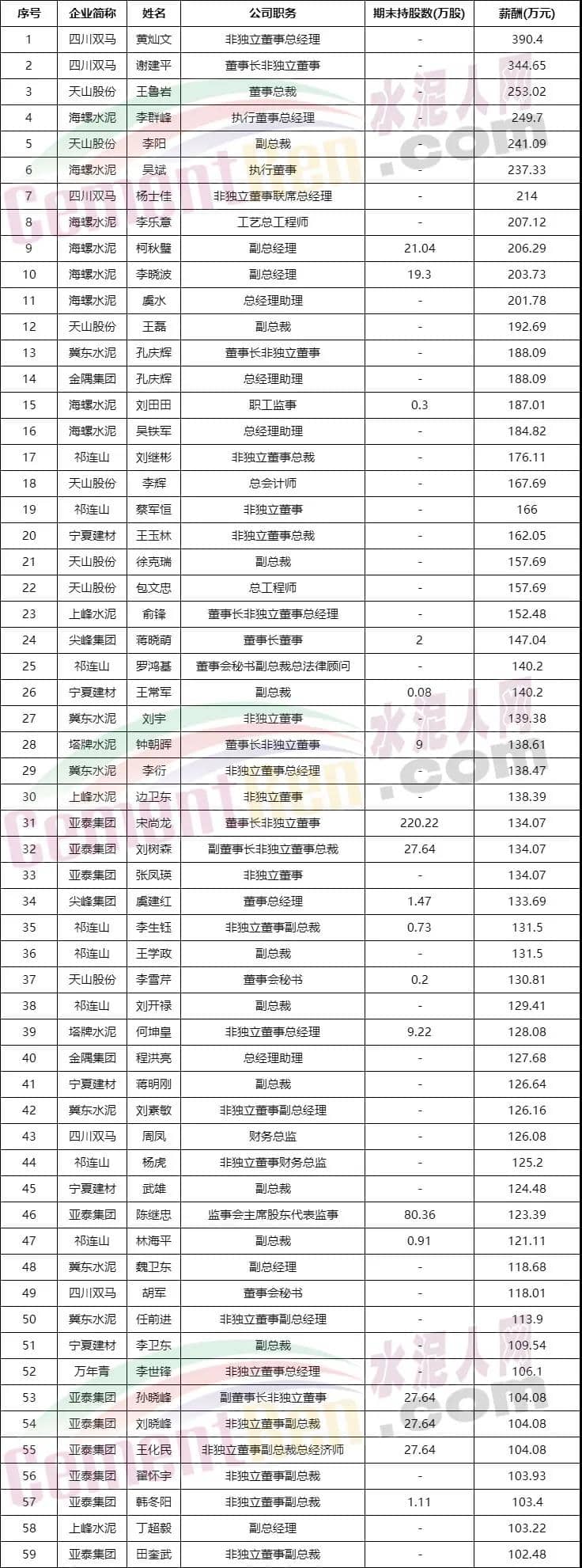從最新公布的高管年薪數(shù)據(jù)來看,四川雙馬董事長黃燦文和總經(jīng)理謝建平分列高管年薪第一位和第二位,分別為390.4萬元和344.65萬元;第三位天山股份董事總裁王魯巖年薪253.2萬元;海螺水泥執(zhí)行董事總經(jīng)理年薪249.70萬元位于第四位。