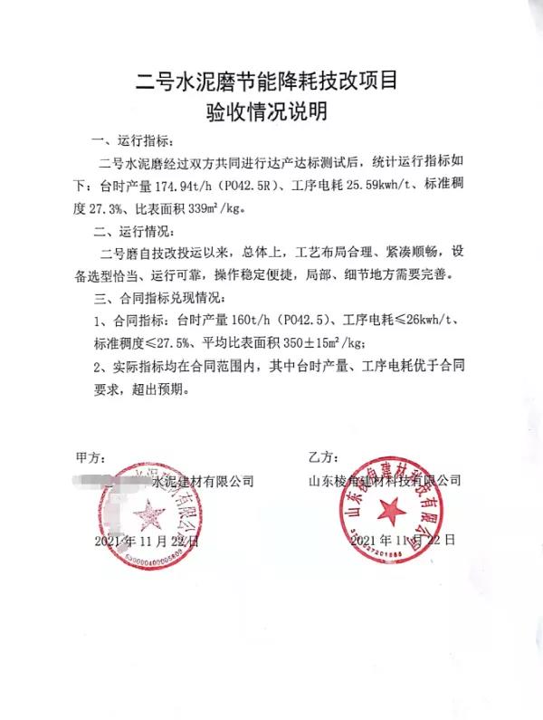 結(jié)束語:山東棱角近三年來承接了山東某公司100萬噸/年水泥粉磨站EPC工程、云南某公司2#水泥磨系統(tǒng)節(jié)能降耗技改EPC工程,在項(xiàng)目初設(shè)、設(shè)備選型、圖紙?jiān)O(shè)計(jì)、土建施工、設(shè)備安裝、非標(biāo)制安、生產(chǎn)調(diào)試等,把控項(xiàng)目的各個階段,安全施工、嚴(yán)把質(zhì)量、緊扣工期節(jié)點(diǎn),均超額完成項(xiàng)目預(yù)期指標(biāo),向業(yè)主遞交了滿意答卷,展現(xiàn)了山東棱角建材科技有限公司從設(shè)計(jì)、建設(shè)到調(diào)試“一條龍”綜合服務(wù)的優(yōu)異能力。
