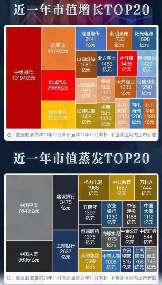 日前,A股市值增長排行榜成為熱議話題,除去期間上市新股,截止到11月30日寧德時(shí)代、比亞迪、長城汽車、貴州茅臺(tái)、隆基股份近一年市值增長居前五,且均超2000億。與此同時(shí),中國平安、中國人壽、建設(shè)銀行、工商銀行、格力電器近一年市值蒸發(fā)居前五。水泥行業(yè)龍頭企業(yè)海螺水泥市值蒸發(fā)1075億也登上了市值蒸發(fā)TOP20榜單。