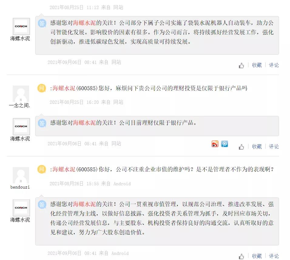 海螺水泥股價(jià)持續(xù)下跌,引起了股民不滿。有股民公開向海螺水泥提問,“請(qǐng)董秘出來說下,現(xiàn)在經(jīng)營情況,股價(jià)下跌問題,給股民一個(gè)交代”。