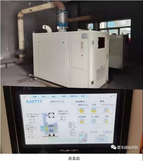 達(dá)成合作后,雷茨智能技術(shù)人員第一時間上門對該水泥廠進(jìn)行現(xiàn)場勘察,經(jīng)過多次的實時測試和技術(shù)討論,最終決定在滿足其生產(chǎn)工藝的情況下,用一臺電機(jī)功率75KW的離心式雷茨空氣懸浮離心風(fēng)機(jī)替代該水泥廠原有的電機(jī)功率110KW的容積式羅茨風(fēng)機(jī)。