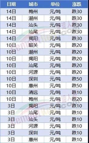 本月廣東省內(nèi)多區(qū)域分別于3日、10日、14日前后三次下調(diào)水泥價格。其中揭陽、汕尾區(qū)域三次累計下跌60元/噸,深圳、惠州于1日、10日兩次下跌累計60元/噸,梅州、潮州、汕頭兩次累計下跌50元/噸。