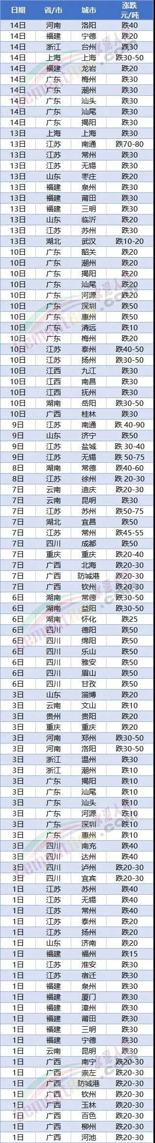 同期周邊江蘇、浙江區(qū)域同步下調(diào)水泥價格。其中江蘇蘇州本月內(nèi)已累計三次下調(diào),分別于1日下調(diào)30元/噸,7日下調(diào)50-75元/噸,13日再次下調(diào)30元/噸;11月分別于23日下跌20元/噸,11日下跌30元/噸,累計下跌近200元/噸。