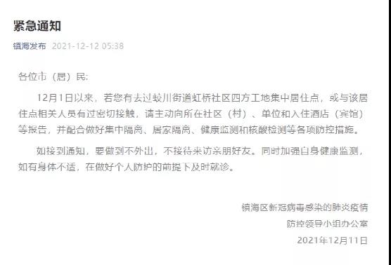 繼江蘇宜興之后,浙江寧波同一工地13人確診。浙江寧波鎮(zhèn)海區(qū)發(fā)布緊急通知,要求自12月1日以來,有去過蛟川街道虹橋社區(qū)四方工地集中居住點(diǎn),或與該居住點(diǎn)相關(guān)人員有過密切接角的人員主動(dòng)向所在社區(qū)(村)、單位和入住酒店(賓館)等報(bào)告 。