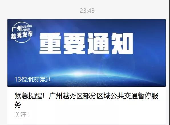 廣州越秀區(qū)部分區(qū)域公共交通暫停服務(wù)。根據(jù)越秀區(qū)防控辦劃定的防范區(qū)(東至淘金北路,南至環(huán)市東路,北至廣深鐵路線,西至麓湖路),廣州市交通運(yùn)輸局即時(shí)起采取措施如下: