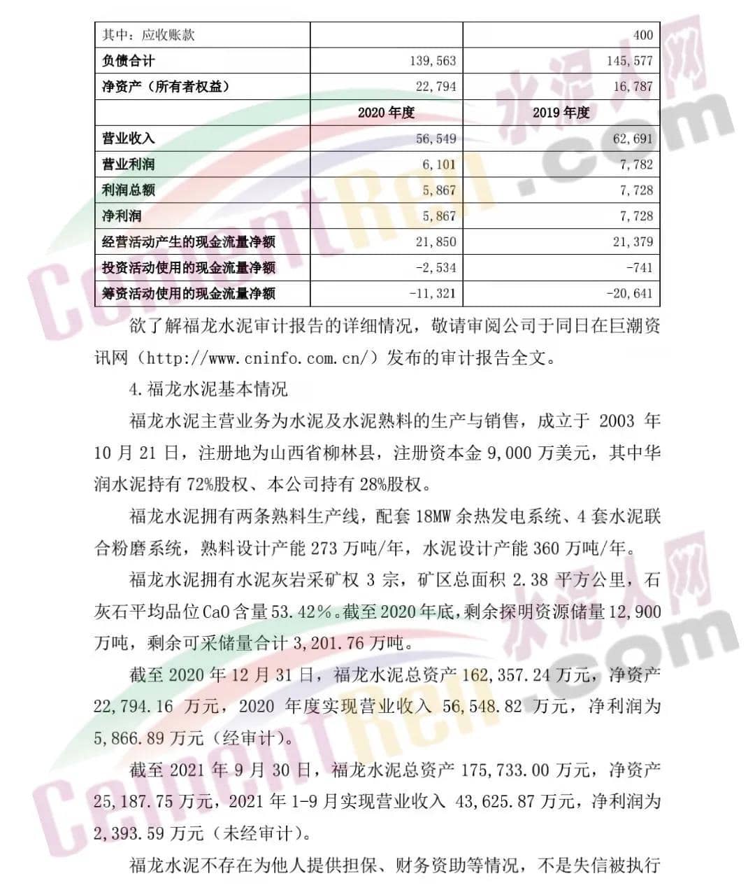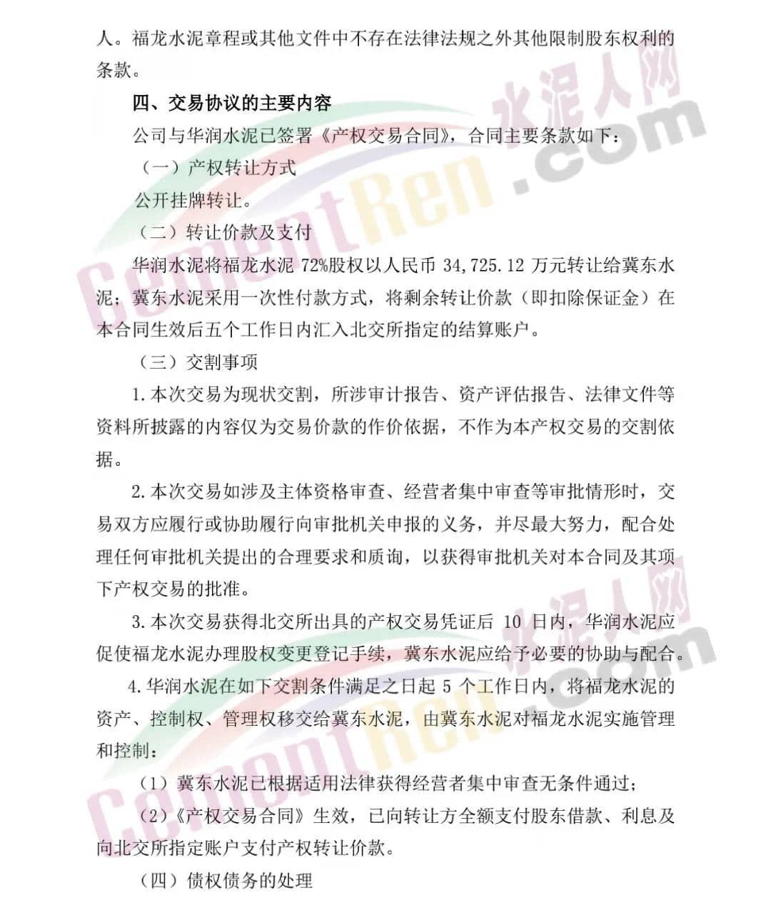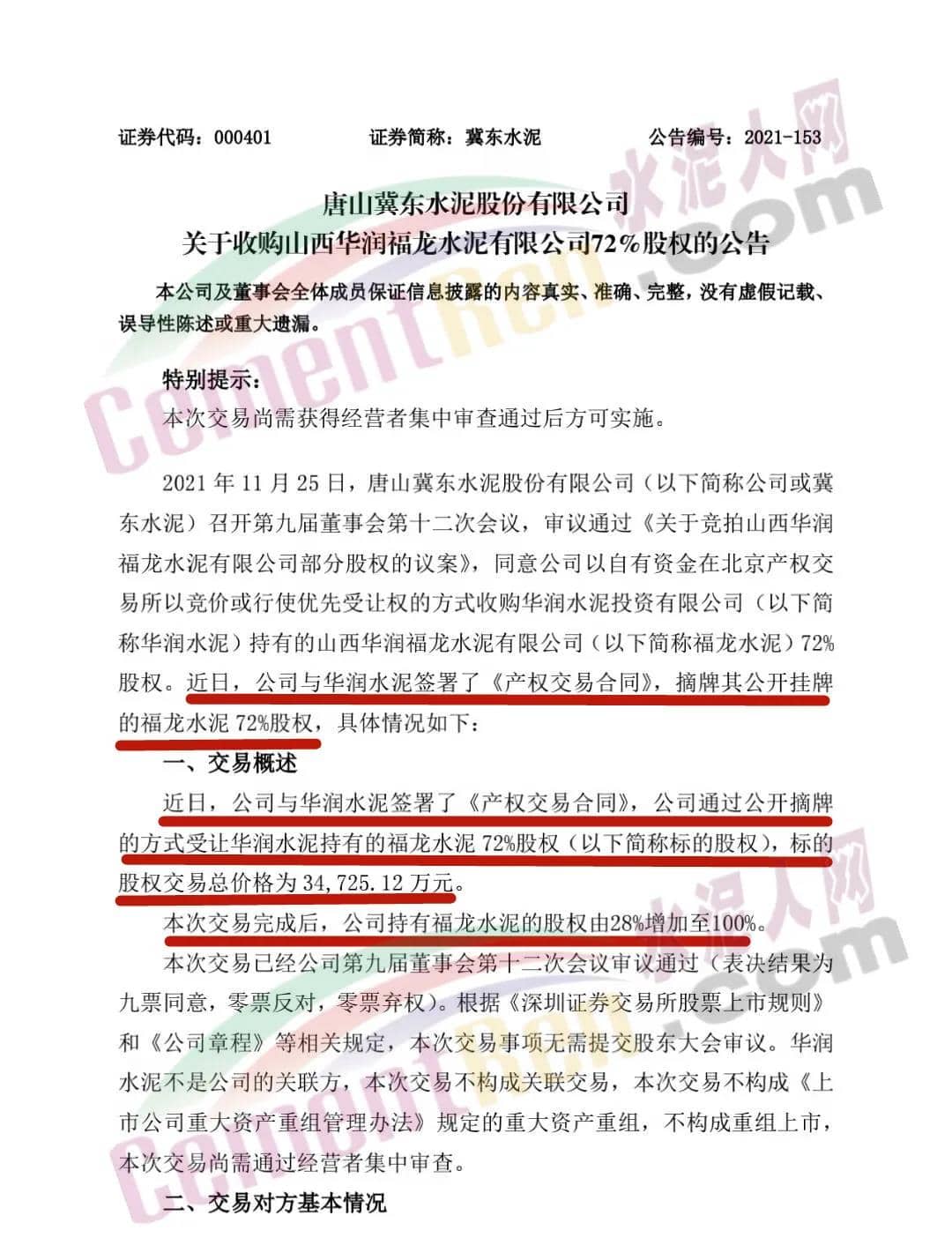 12月15日晚間,冀東水泥發(fā)布公告稱,近日,公司通過公開摘牌的方式受讓華潤水泥持有的福龍水泥72%股權(quán),標(biāo)的股權(quán)交易總價格為3.47億元。此次交易完成后,公司持有福龍水泥的股權(quán)由28%增加至100%。福龍水泥擁有完整的水泥熟料生產(chǎn)線,裝備和工藝水平比較先進,擁有資源品位較好的石灰石礦山,周邊輔材豐富,生產(chǎn)成本在區(qū)域處于領(lǐng)先水平。此次交易有利于公司優(yōu)化山西區(qū)域的產(chǎn)能結(jié)構(gòu)。