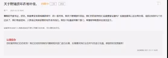 在人民網(wǎng)領(lǐng)導(dǎo)留言板,近期就有安徽歙縣,甘肅文縣、清水縣、舟曲縣,寧夏海原縣,安徽明光市,河南澠池縣,黑龍江牡丹江市等多地網(wǎng)友反映野豬成災(zāi)問(wèn)題。官方回復(fù)中有提到為保護(hù)群眾財(cái)產(chǎn),四川、安徽等多地成立狩獵隊(duì),調(diào)控野豬數(shù)量。也有村民表示不知道找哪個(gè)部門(mén)。