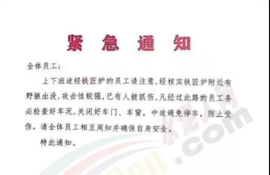 在內(nèi)蒙古草原地區(qū),一家水泥企業(yè)曾發(fā)緊急通知提示上下班途經(jīng)有狼出沒(méi)路段的的員工需注意躲避野狼,務(wù)必檢查好車(chē)況,關(guān)閉好車(chē)門(mén)、車(chē)窗,中途避免停車(chē),防止受傷。
