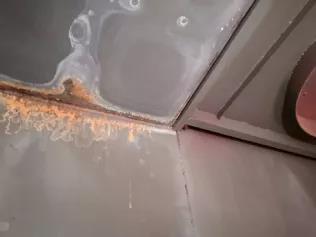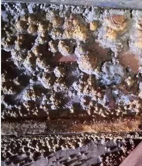 硫酸氫銨具有較強的吸附性、粘性和吸濕性,附著在殼體壁板表面后吸附粉塵、水分以及更多的腐蝕物質,使得附著點腐蝕加速,形成大量腐蝕產物。硫酸氫銨腐蝕典型的特征為腐蝕產物形成密集腐蝕堆,外觀表象多為暗黃色及灰黃色,且周圍分布有白色結晶鹽。