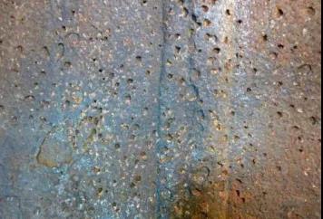 在殼體金屬表面產生大量點蝕坑,是氯離子腐蝕最主要的腐蝕特征。殼體應力集中的區(qū)域,Cl-的存在還會加速應力腐蝕的發(fā)展,使得殼體基材快速斷裂失效。夾角等細小縫隙區(qū)域,Cl-會加速縫隙腐蝕,快速破壞殼體基材。