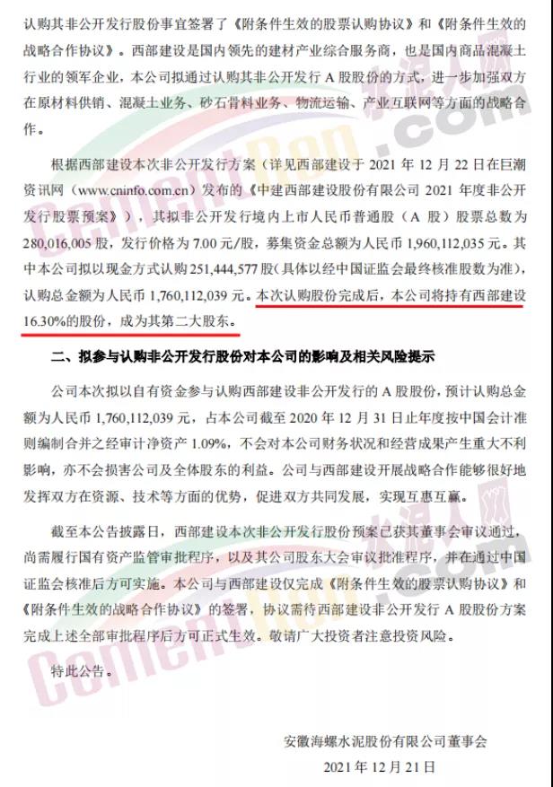 海螺水泥12月21日晚間公告,擬以自有資金約17.6億元人民幣參與認(rèn)購西部建設(shè)非公開發(fā)行的A股股份,認(rèn)購數(shù)量為2.51億股。本次認(rèn)購股份完成后,本公司將持有西部建設(shè)16.3%的股份,成為其第二大股東。
