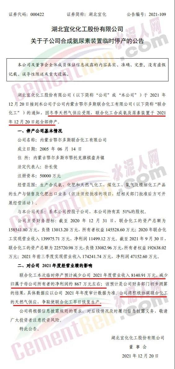 近日,國內(nèi)化肥巨頭湖北宜化集團(tuán)發(fā)布公告稱,于2021年12月20日接到其子公司內(nèi)蒙古鄂爾多斯聯(lián)合化工有限公司的通知,因冬季天然氣供應(yīng)受限,聯(lián)合化工合成氨及尿素裝置于2021年12月20日起全部停產(chǎn)。