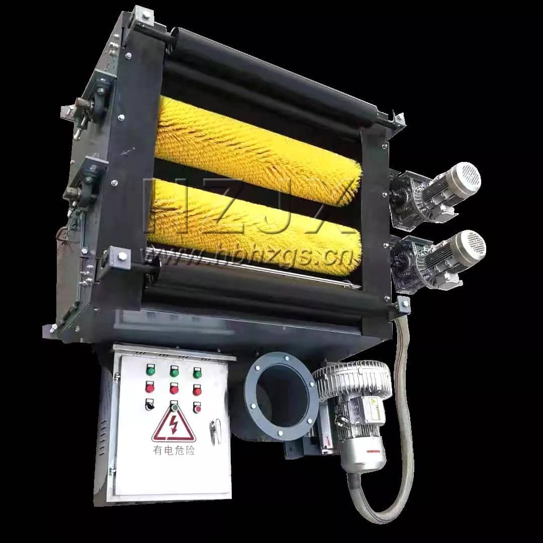 6.本裝置由引風(fēng)機、箱體、濾筒、風(fēng)包、電磁脈沖閥等構(gòu)成。箱體與智能滾刷清掃箱組成一密閉的空間,當(dāng)皮帶運行,智能滾刷清掃箱內(nèi)粉塵揚起,引風(fēng)機運行,在箱體內(nèi)產(chǎn)生負壓,智能滾刷清掃箱內(nèi)風(fēng)流經(jīng)濾筒過濾、從引風(fēng)機排到周圍空氣中,每當(dāng)引風(fēng)機運行3min,控制系統(tǒng)先自動停止引風(fēng)機運行,等待7秒,再自動控制電磁脈沖閥開啟,風(fēng)包內(nèi)的壓縮空氣對濾筒內(nèi)部進行噴吹,將附著在濾筒表面的灰塵震落在皮帶上,持續(xù)3秒停止,再自動開啟引風(fēng)機運行,如此循環(huán)。用途:智能滾刷清掃箱主要用于皮帶輸送機下皮帶的清掃,主要是對于皮帶上粘附的煤泥,輸送帶表面不平整有坑洞現(xiàn)象等。當(dāng)皮帶運行信號,給我方設(shè)備信號,我方收到信號以后開始啟動滾刷,刷輪轉(zhuǎn)動是和輸送帶運行方向相反,隨著皮帶的運行,到達壓帶托輥位置,托輥是壓緊回程皮帶,從而達到清掃效果。能有效解決皮帶的清掃以及現(xiàn)場環(huán)境的清理,極大的較少了人為的清理散落物料。