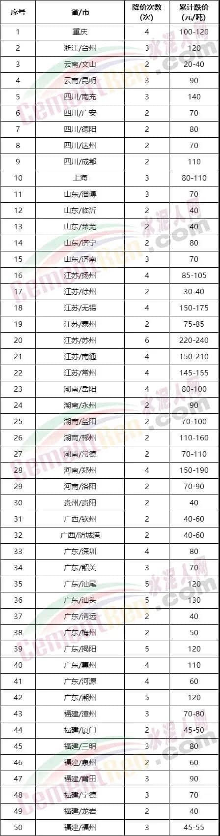 12月份多區(qū)域水泥價(jià)格持續(xù)下跌中,據(jù)不完全統(tǒng)計(jì),江蘇蘇州、南充等區(qū)域水泥價(jià)格月內(nèi)下跌達(dá)到200元/噸以上,蘇州區(qū)域6次下調(diào)水泥價(jià)格,累計(jì)跌價(jià)達(dá)到240元/噸。而且,除了江蘇,浙江、山東、福建、四川、云南、貴州、湖南、河南、廣東、廣西、上海、重慶等10余個(gè)省市自治區(qū)50個(gè)區(qū)域水泥價(jià)格均經(jīng)歷了2次以上的下跌。