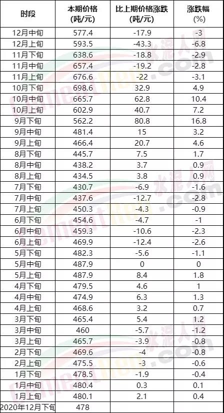 從上述數(shù)據(jù)可見,P.O42.5散裝水泥2021年12月上旬較11月下旬降幅達到4.5%,價格下跌了25.6元/噸,為全年降幅最大的時段;9月下旬較中旬上漲了19%為全年漲幅最大的時段,水泥價格上漲了87.4元/噸。