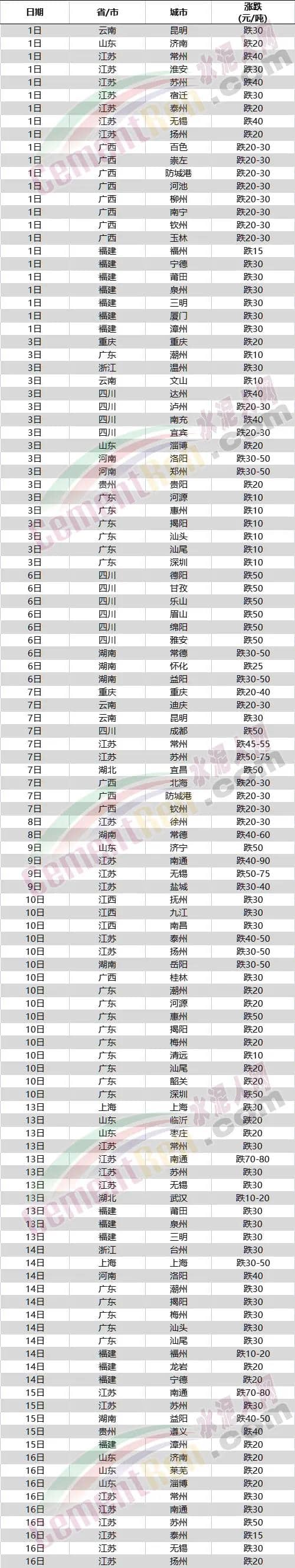 10月份以來,廣東梅州連續(xù)十次下調(diào)水泥價格,創(chuàng)造了2021年內(nèi)連跌紀(jì)錄。2021年最后一個月,水泥價格持續(xù)下行,部分區(qū)域月內(nèi)連續(xù)5輪以上連續(xù)下跌。廣東潮州、揭陽以及江蘇蘇州分別經(jīng)歷了6輪連跌,蘇州累計跌價達220-245元/噸。