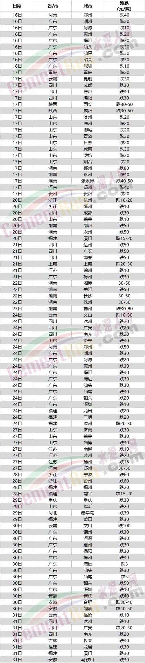 2021年1月、2月上旬和下旬、3月中上旬、5月下旬、6月、7月、11月、12月中上旬水泥價格均有不同幅度的下跌;3月下旬、4月、5月中上旬、8月、9月、10月有不同幅度的上漲。