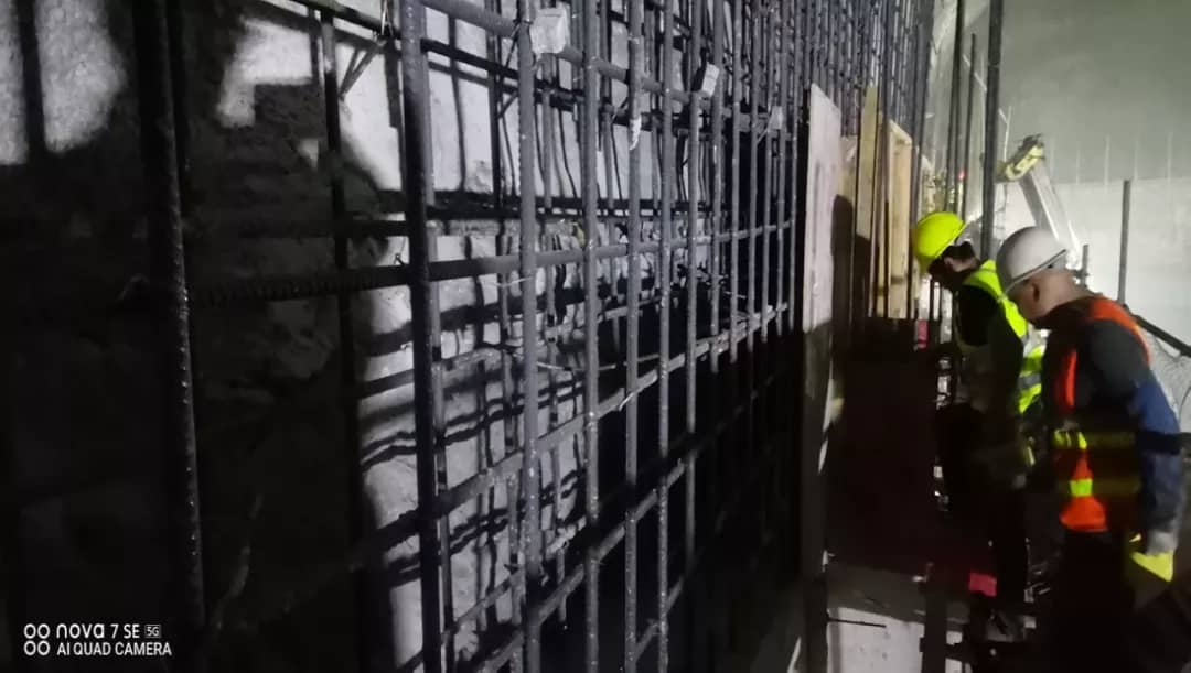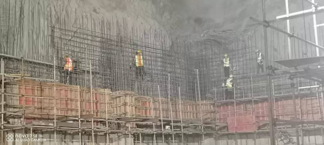 1#、2#破碎硐室是整個(gè)開拓系統(tǒng)工程的“咽喉”,上連主礦倉,下連皮帶輸送平硐,其施工質(zhì)量和進(jìn)度對整個(gè)開拓系統(tǒng)工程至關(guān)重要。破碎硐室圍巖性質(zhì)較差,且斷面大,高度高,凈高度達(dá)25米,對硐室開挖和支護(hù)帶來很大困難;破碎硐室后期腳手架搭設(shè)量大,鋼筋制作、綁扎量大,模板工程量大,混凝土澆筑量大,結(jié)構(gòu)復(fù)雜,且作業(yè)空間受限,給土建施工帶來極大的挑戰(zhàn)。對于1#、2#破碎硐室的施工,為保證安全、質(zhì)量和進(jìn)度,項(xiàng)目部多次組織圖紙會(huì)審,認(rèn)真分析每個(gè)施工環(huán)節(jié),在施工過程中合理安排施工順序,加強(qiáng)組織協(xié)調(diào),增開措施巷道,有效地保證了破碎硐室的順利施工。