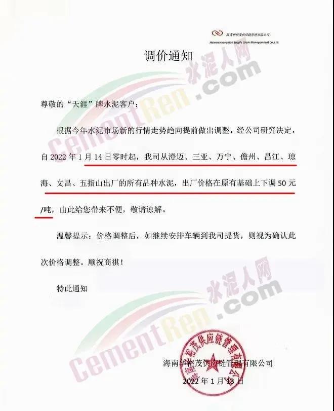 1月13日海南華裕茂供應鏈管理有限公司通知,根據(jù)今年水泥市場新的行情走勢趨向提前做出調整。經(jīng)公司研究決定,自2022年1月14日零時起,從澄邁、三亞、萬寧、儋州、昌江、瓊海、文昌、五指山出廠的所有品種水泥,出廠價格在原有基礎上下調50元/噸。
