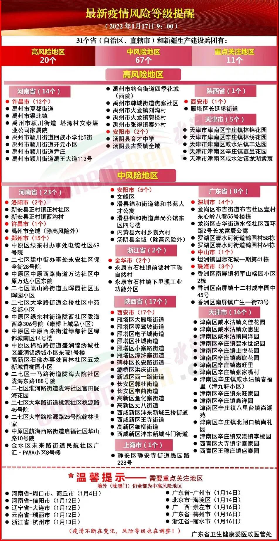 國家衛(wèi)健委消息,1月16日0-24時,31個省(自治區(qū)、直轄市)和新疆生產(chǎn)建設(shè)兵團(tuán)報告新增確診病例223例。截至2022年1月17日9時,全國疫情:高風(fēng)險等級地區(qū)20個,中風(fēng)險等級地區(qū)67個,重點關(guān)注地區(qū)11個。