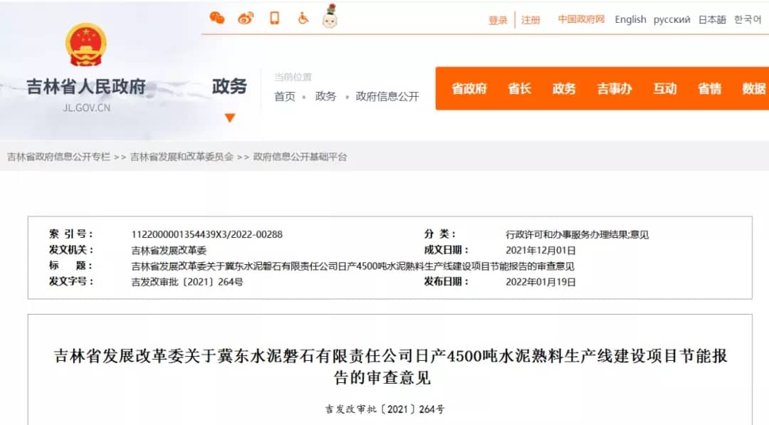 你局《關(guān)于申請(qǐng)審查冀東水泥磐石有限責(zé)任公司日產(chǎn)4500噸水泥熟料生產(chǎn)線建設(shè)項(xiàng)目節(jié)能報(bào)告的請(qǐng)示》(磐發(fā)改請(qǐng)字﹝2021﹞29號(hào))收悉。該項(xiàng)目(項(xiàng)目代碼:2103-220284-07-01-120516)總投資141801.96萬(wàn)元,總用地面積656000平方米,總建筑面積91377.64平方米,共建設(shè)建筑物12座,淘汰日產(chǎn)2500噸低效熟料生產(chǎn)線1條,新建日產(chǎn)熟料4500噸新型干法水泥生產(chǎn)線1條,同步配套建設(shè)9MW低溫余熱發(fā)電系統(tǒng)、脫硝工程、脫硫工程及60萬(wàn)噸/年礦渣磨粉生產(chǎn)線,購(gòu)置設(shè)備共計(jì)6418臺(tái)(套)。項(xiàng)目建成后可年產(chǎn)熟料139.5萬(wàn)噸、水泥195萬(wàn)噸。根據(jù)吉林省節(jié)能評(píng)審中心《關(guān)于報(bào)送<冀東水泥磐石有限責(zé)任公司日產(chǎn)4500噸水泥熟料生產(chǎn)線建設(shè)項(xiàng)目節(jié)能報(bào)告評(píng)審意見(jiàn)>的報(bào)告》(吉能評(píng)﹝2021﹞66號(hào)),經(jīng)審查,具體意見(jiàn)如下: