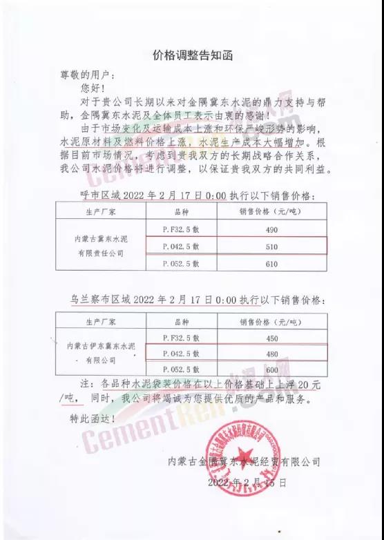 日前,內蒙古金隅冀東水泥經貿有限公司發(fā)布《價格調整告知函》稱,由于市場變化及運輸成本上漲和環(huán)保嚴峻形勢的影響,水泥原材料及燃料價格上漲,水泥生產成本大幅增加。根據目前市場情況,上調公司水泥價格。呼市區(qū)域自2月17日0時起執(zhí)行P.F32.5散490元/噸,P.O42.5散510元/噸,P.O52.5散610元/噸;