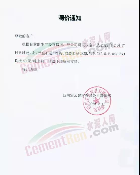 四川宏云建材有限公司營銷部通知,根據目前的生產經營情況,經公司研究決定,從2022年2月17日8時起,宏云“金石通”牌袋、散裝水泥(M32.5、P.C42.5、P.O42.5R)均按50元/噸上調。