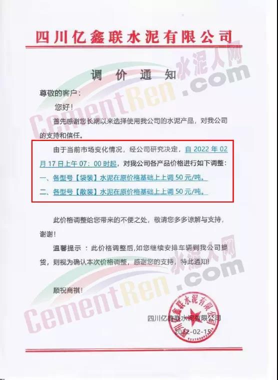 四川億鑫聯水泥有限公司通知,由于當前市場變化情況,經公司研究決定,自2022年2月17日上午7時起,對公司各產品價格進行調整。各型號水泥在原價格基礎上上調50元/噸。