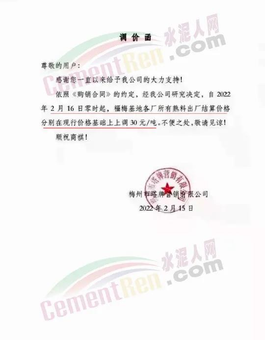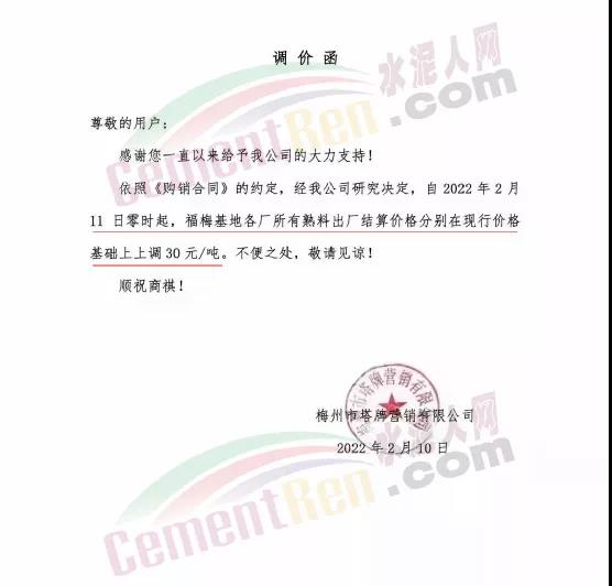廣東梅州塔牌水泥通知自2022年2月16日零時起,福梅基地各廠所有熟料出廠結算價格分別在現行價格基礎上上調30元/噸。節(jié)后兩次調漲累計漲60元/噸。