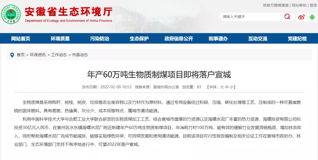 安徽省生態(tài)環(huán)境廳消息:年產(chǎn)60萬(wàn)噸生物質(zhì)制煤項(xiàng)目即將落戶宣城。其中提到,海螺投資有限公司擬投資30億元人民幣,在宣州區(qū)海螺水泥廠附近新建年產(chǎn)60萬(wàn)噸生物質(zhì)制煤項(xiàng)目,該項(xiàng)目可望2022年落戶宣城。